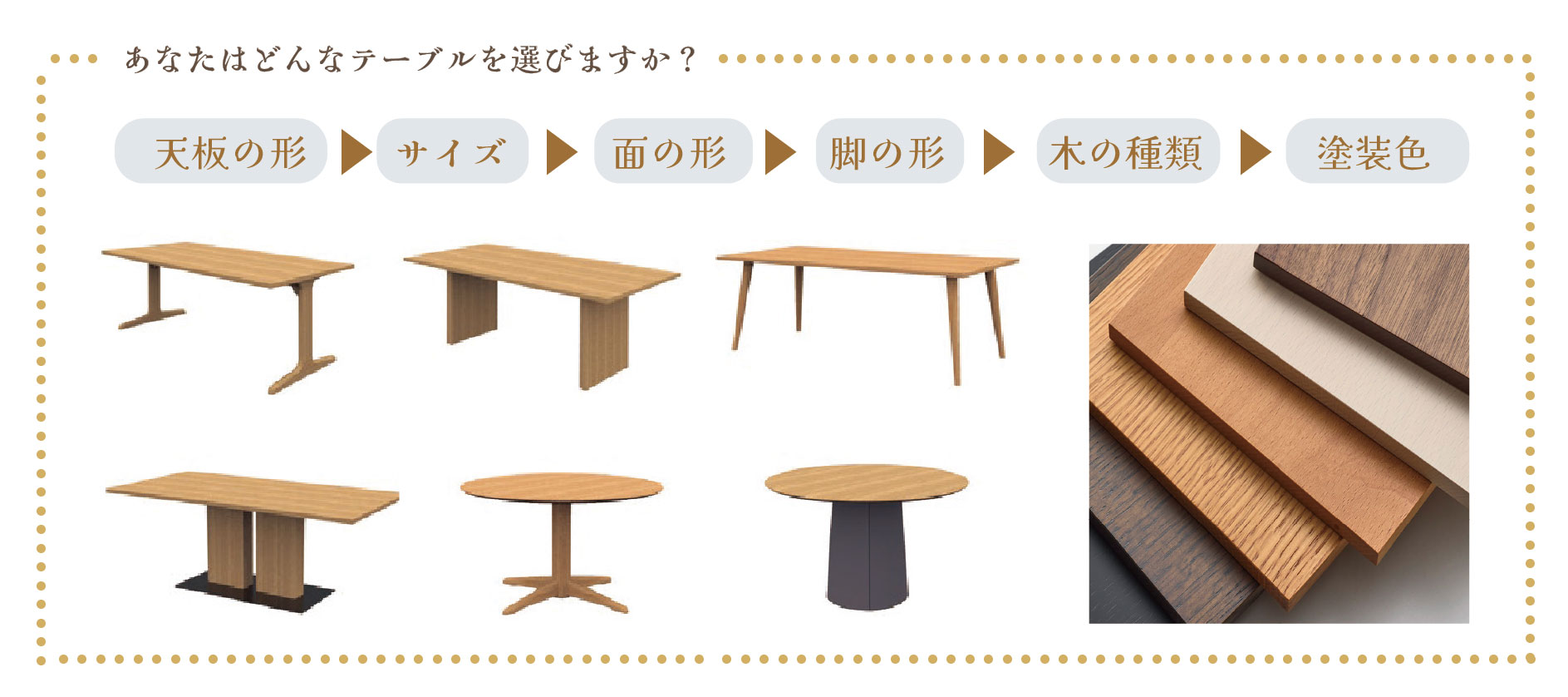 天板の形・サイズ・脚の形・木の種類・塗装の色 等‥